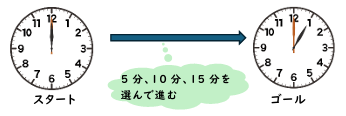 もしも、子どもが15分進んだら12時55分。先生が5分を選んで進めば、1時ちょうどになる。
