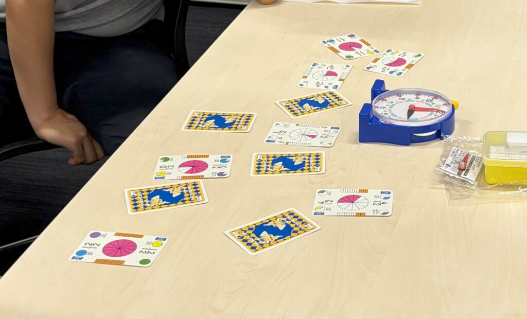 分数トランプをはじめて手にしました。時計はもちろん角度や割合の勉強に使えそう。先生に教わった「押し付けない!しつこくしない!」を肝に銘じ、まずは子どもたちに自由に遊ばせてみます。(大分県大分市立小学校先生)
